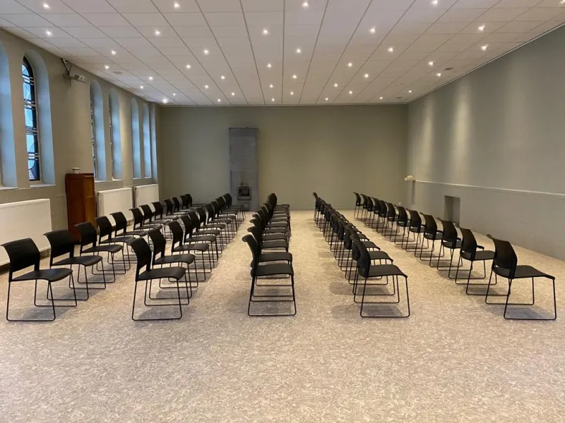Bovendien heeft deze zaal een speksteenkachel dewelke in de winter een gezellige warmte uitstraalt. De zaal geeft uit op de iconische kloostergang.